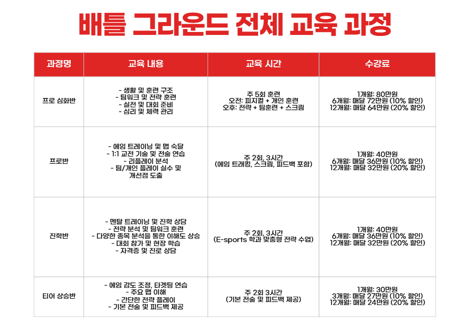 프로게이머를 꿈꾸는 분들을 위해 설계되었으며, 학생들이 게임 내 최상위 티어를 유지하고 프로 데뷔까지 도달할 수 있도록 체계적으로 지원합니다.